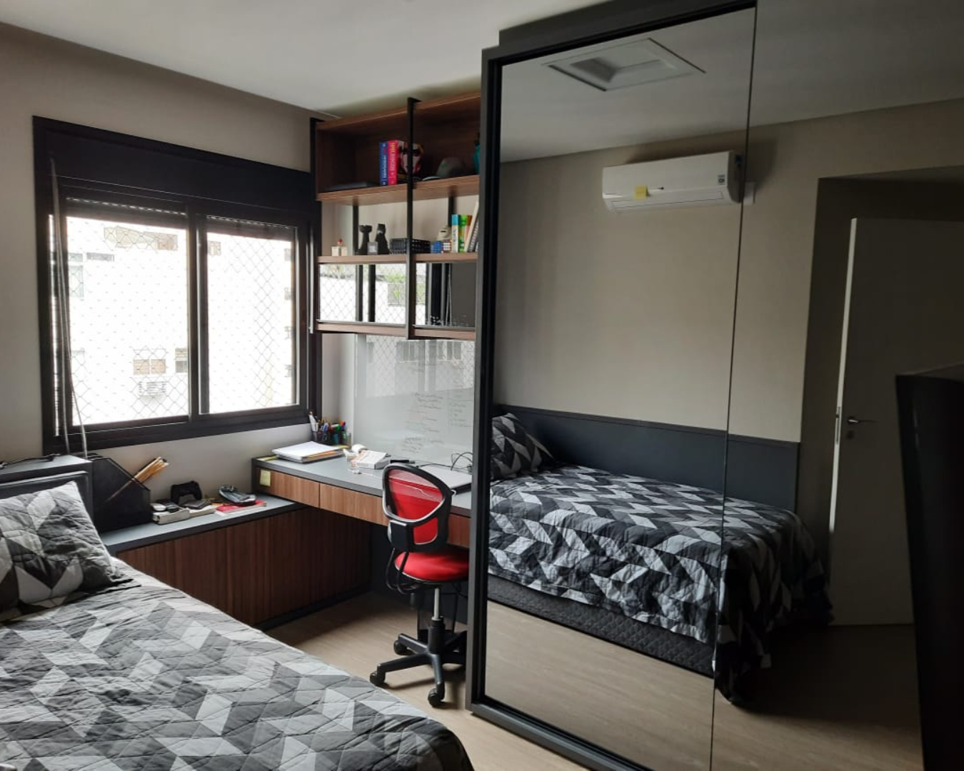 Aquele quarto que é pura sofisticação. Lâmina de madeira natural, laca e vidro acidato.