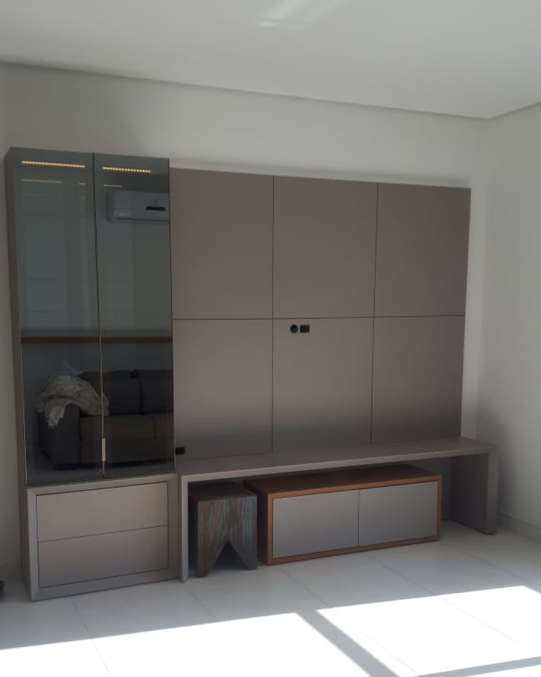 Painel em MDf Duratex Titânio e MDF Arauco Louro Freijó.